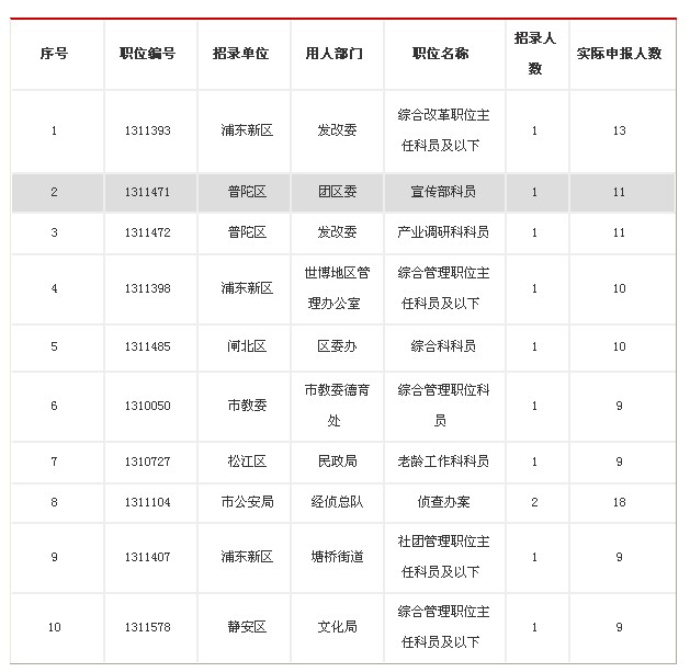 摘要 截止18日下午6時,報考錄取比例最高的職位為浦東新區發改委綜合改革主任科員及以下。