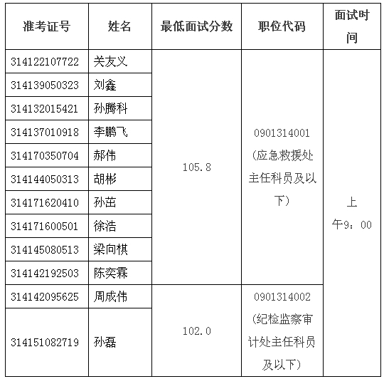 注:1.進入應急救援處主任科員及以下招錄崗位面試名單考生劉偉、進入面試遞補考生程鵬自愿面試資格,我局按筆試綜合成績排名高低遞補陳奕霖進入面試。