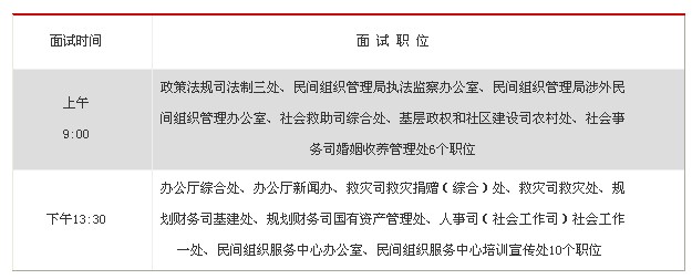面試按不同職位分上、下午進行,請考生按各職位要求分別于相應時間報到并參加面試。具體安排如下: