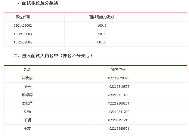 每個崗位參加面試人員按照面試成績和筆試成績各占50%的計算方法計算綜合成績,按照綜合成績從高到低1:1比例進入體檢和考察。若現有崗位面試人數少于錄用計劃3倍的,考生的面試成績應達到當天面試考官組面試的所有人員的平均分,方可進入體檢和考察。