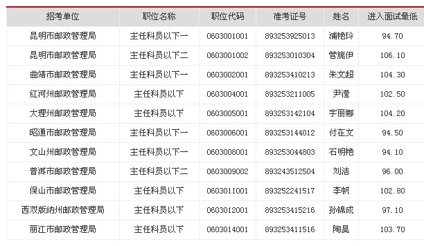 由于部分考生個(gè)人自愿放棄面試資格,根據(jù)中央機(jī)關(guān)及其直屬機(jī)構(gòu)考試錄用公務(wù)員的有關(guān)規(guī)定,按公共科目筆試成績由高到低的順序,確定以下11人遞補(bǔ)參加2013年度云南省郵政管理局公務(wù)員招錄面試。