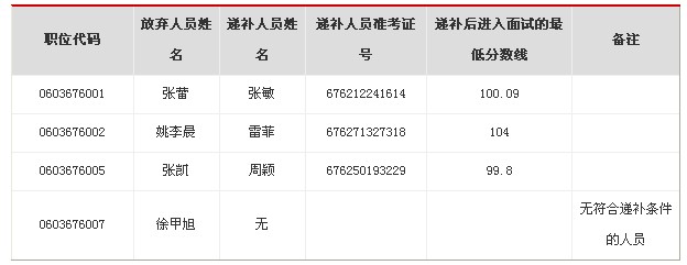 因部分進入面試名單的考生自愿放棄面試資格,根據有關規定,我局從國家公務員局發布的面試遞補人員名單中按照成績由高到低的順序進行遞補。遞補人員如下: