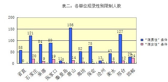此次公安系統(tǒng)招錄某些職位由于工作環(huán)境或特點的特殊性,對考生的性別也做出了明確的限制。例如,省直省公安廳招錄的“省高速總隊科員C”一職,報考條件中明確規(guī)定“男性,30周歲以下。應屆碩士、博士研究生(非在職)和報考法醫(yī)職位的,不超過35周歲。符合招錄人民警察的身體和政治條件。在省內(nèi)石家莊市以外高速公路沿線工作”。而石家莊市公安局招錄的“計算機類科員G”一職,在報考條件中又規(guī)定“女,30周歲以下,應屆碩士、博士研究生(非在職)35周歲以下”。今年諸如此類的性別限制不在少數(shù),具體數(shù)據(jù)可參看下表。