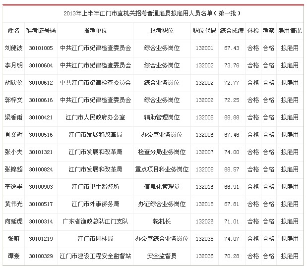 根據(jù)經(jīng)2013年上半年江門市直機關(guān)普通雇員考試,劉健波等13 名同志符合雇用條件,擬同意雇用,現(xiàn)予以公示。公示期間,如對擬雇用人員有異議,可通過來信、來電、來訪等形式向我們反映。公示期滿,對沒有問題或反映問題不影響雇用的,按程序辦理雇用手續(xù)。
