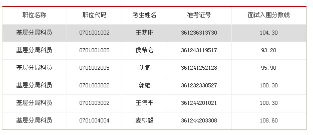 因個別考生放棄面試資格,以及個別考生資格復審不合格,根據公務員招考有關規定,擬在公共科目筆試合格的考生中,按照筆試成績從高到低的順序,遞補以下考生為面試人選: