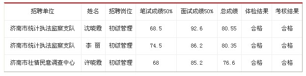 根據《2012年濟南市市屬事業單位公開招聘工作人員簡章》的規定,經過報名、資格審核、筆試、面試、考核、體檢等程序,確定3名擬聘用人員,現公示如下: