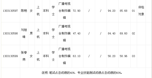 2013年5月11日上杭縣廣電局部分事業單位工作人員專業技能測試工作已經結束,現將測試總成績及體檢對象公布如下: