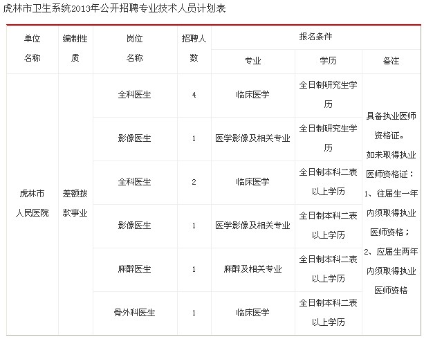 1、招聘崗位。虎林市人民醫院部分科室醫生(詳見附表)。