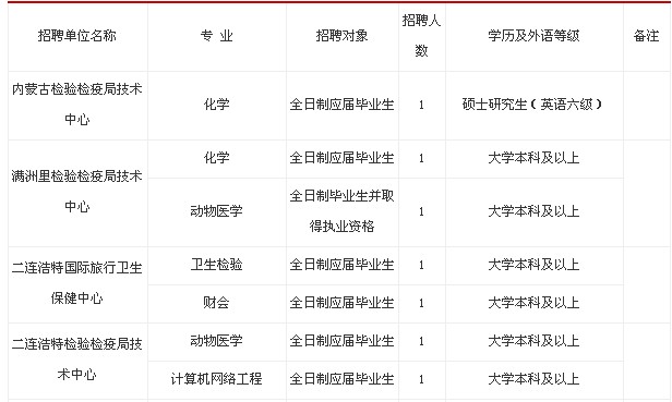 中華人民共和國內蒙古出入境檢驗檢疫局為國家質量監督檢驗檢疫總局設在內蒙古的直屬機構,下設14個分支局、2個辦事處。設有12個事業單位,分布在內蒙古局機關、滿洲里、二連浩特、包頭和赤峰檢驗檢疫局。事業單位主要承擔實驗室檢驗檢疫技術工作、研究咨詢及檢疫風險分析、傳染病監測體檢、國際旅行預防接種、技術開發服務、機關后勤服務等職能。根據事業發展需要,2013年擬招聘事業單位工作人員11名。招錄計劃如下: