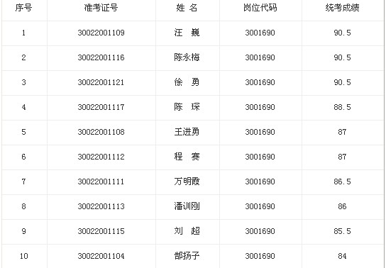 根據應聘人員統考筆試成績從高分到低分的順序,按照1∶5比例確定參加專業測試人員名單,并進行資格復審(名單、成績附后)。