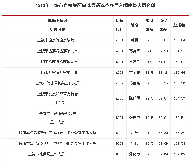 根據中共上饒市委組織部、上饒市人力資源和社會保障局《關于做好2013年市直機關面向基層遴選公務員工作的通知》(饒組字[2013]6號)文件精神,經筆試、面試,按從高分到低分依序錄用原則,已產生入闈體檢人員10名,F將入闈人員姓名、筆試、面試成績和總分予以公告(具體名單附后)。