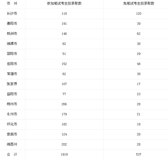 我省選聘高校畢業(yè)生到村任職報名和筆試工作已完成,根據(jù)《湖南省2013年選聘高校畢業(yè)生到村任職公告》,筆試免考生全部參加面試,按報名人數(shù)適當比例確定免筆試考生選聘名額。參加筆試考生選聘名額,為各市州選聘計劃總數(shù)減去免筆試考生選聘數(shù)。2013全省選聘名額計劃為2456名,共有12433名參加筆試考生和2120名免筆試考生。其中參加筆試考生招錄計劃1919名,免筆試考生招錄計劃537名,各市州選聘名額計劃劃分公告如下: