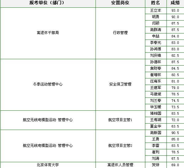 按照2013年中央單位接收安置軍轉干部工作的相關部署和要求,現將國家體育總局接收安置軍轉干部面試人員名單和成績公告如下: