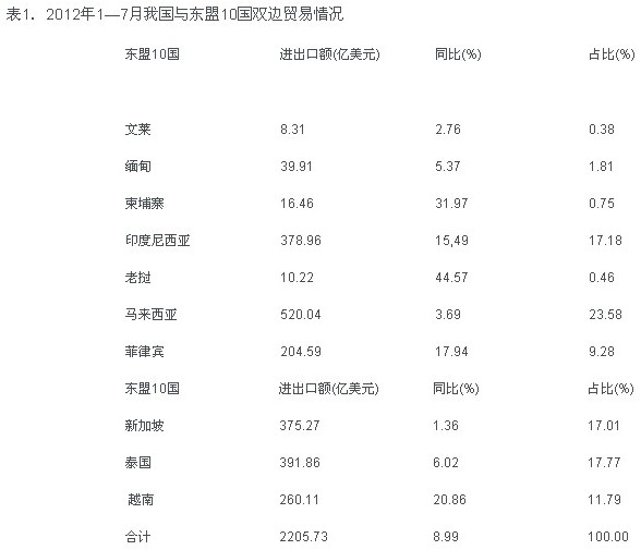 A. 2012年1―7月,外商投資企業與東盟10國的進出口貿易額同比增長6.06%