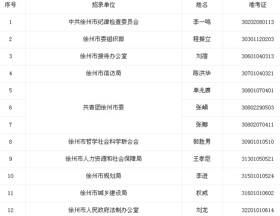 2013年江蘇徐州市級機關擬錄用公務員名單(第一批)