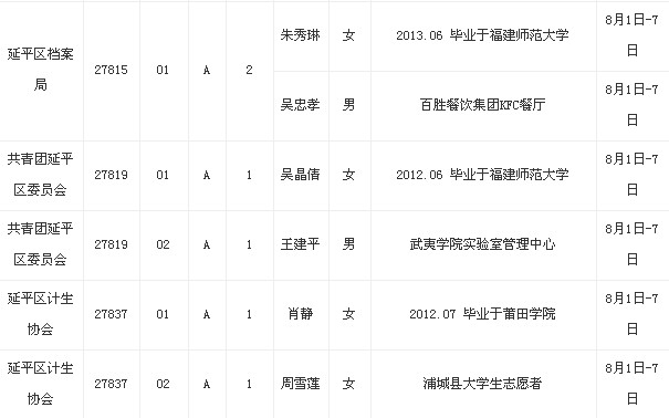 現根據《2013年福建省考試錄用公務員公告》及南平市招考簡章要求,陸續對考試、體檢、考察合格擬錄用國家公務員和參照公務員法管理機關(單位)工作人員名單進行公示(具體公示期見表格),在此期間歡迎廣大群眾以來信來電來訪的形式實事求是反映情況,接待(來信投遞)科室:南平市委組織部干部三科,聯系電話:8823008。