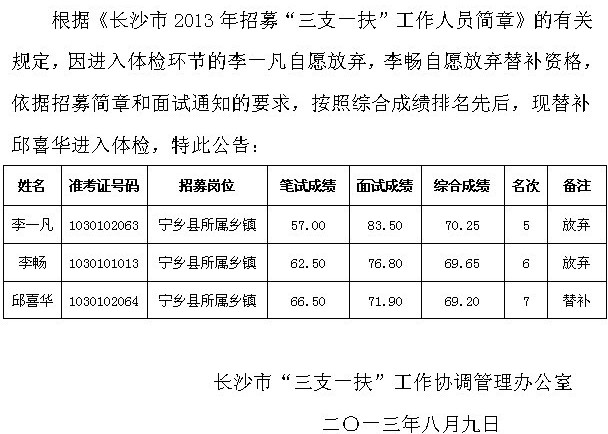 2013年湖南長沙市“三支一扶”人員體檢替補公告