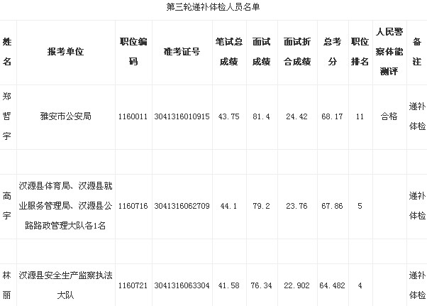 根據中共雅安市委組織部、雅安市人力資源和社會保障局《關于2013年上半年公開考試錄用公務員(參照公務員法管理單位工作人員)的公告》規定,現將因體檢后放棄、考察不合格等需進行第三輪遞補人員名單及第三輪遞補體檢安排通知如下: