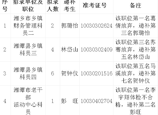 經過8月7日集體體檢和8月16日復檢,我市共有3名考生放棄體檢資格,1名考生體檢不合格。根據《2013年湖南省考試錄用公務員公告》精神,經用人單位書面申請,市公務員主管部門同意,對這四個職位按綜合成績由高到低順次遞補。