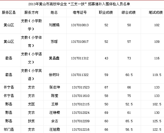 摘要 2013年安徽黃山三支一扶考試遞補體檢通知