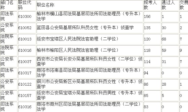 2013年陜西政法干警考試報名最熱職位(8月29日)