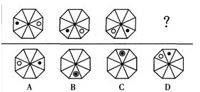 答案:C 解析:本題屬于位置類,主要考察平移。小黑點依次逆時針移動1格,2格;小白圈依次順時針移動1格,2格;照此規律,小黑點再逆時針移動3格,小白圈再順時針移動3格得到下一幅圖形。所以選擇C選項。