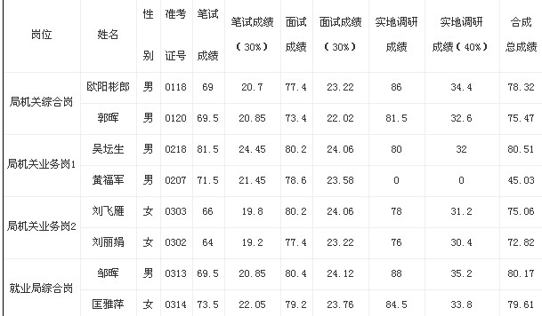 根據《2013年吉安市人力資源和社會保障局公開遴選公務員(參公單位工作人員)方案》的有關規定,按照筆試、面試、調研成績分別占30%、30%、40%合成總成績,從高分到低分按1:2比例確定體檢和考察對象,現將入闈體檢和考察對象名單公示如下: