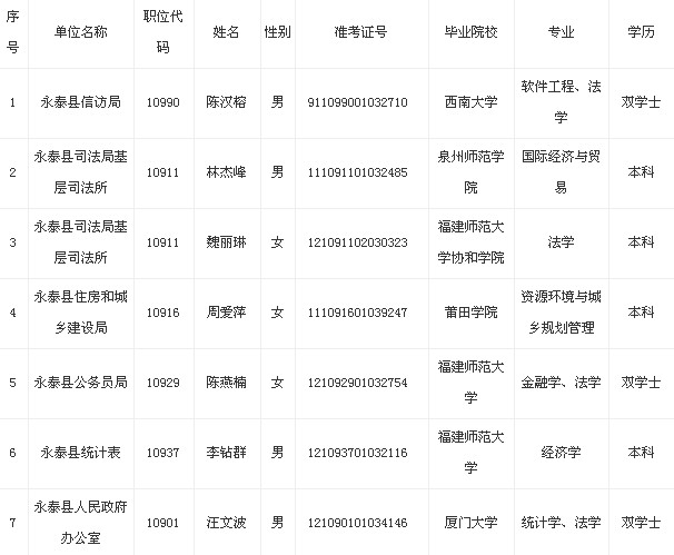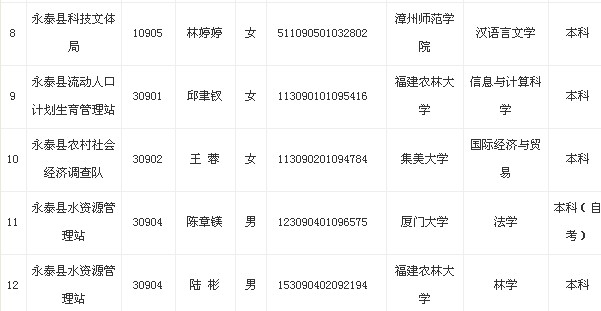 2013年福建福州永泰縣政府系統擬錄用公務員名單公示