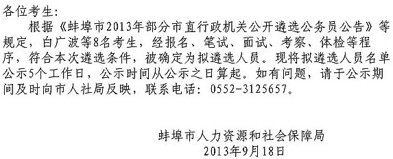 摘要 2013年安徽蚌埠市直行政機關擬錄用公務員名單