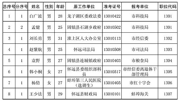 2013年安徽蚌埠市直行政機關擬錄用公務員名單