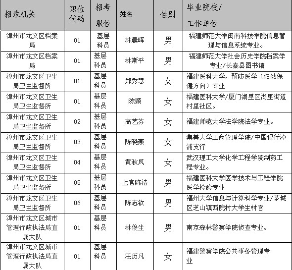 根據《公務員錄用規定(試行)》和《福建省2013年度考試錄用公務員工作實施方案》的要求,在筆試、面試、體檢和考察的基礎上,擬錄用以下同志為公務員或參照管理工作人員。現向社會予以公示。公示期間,如有問題,請及時向漳州市公務員局職位管理與考錄科反映。