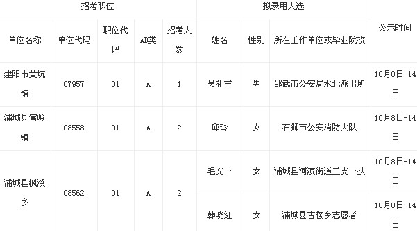 現根據《2013年福建省考試錄用公務員公告》及南平市招考簡章要求,陸續對考試、體檢、考察合格擬錄用國家公務員和參照公務員法管理機關(單位)工作人員名單進行公示(具體公示期見表格),在此期間歡迎廣大群眾以來信來電來訪的形式實事求是反映情況,接待(來信投遞)科室:南平市委組織部干部三科,聯系電話:8823008。