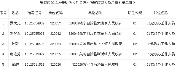 根據《貴州省2013年省、市、縣、鄉四級機關統一面向社會公開招考公務員和選調高校畢業生到基層工作簡章》、《貴州省2013年法院、檢察院、公安(森林公安)、司法機關統一面向社會公開招考人民警察簡章》、《貴州省2013年選調高校優秀畢業生到基層工作簡章》規定,經市公務員招考辦研究,現將第二批政審考察人員名單予以公示。