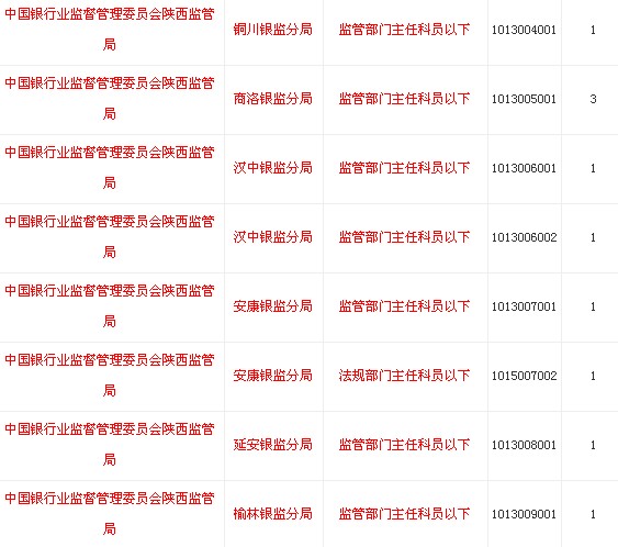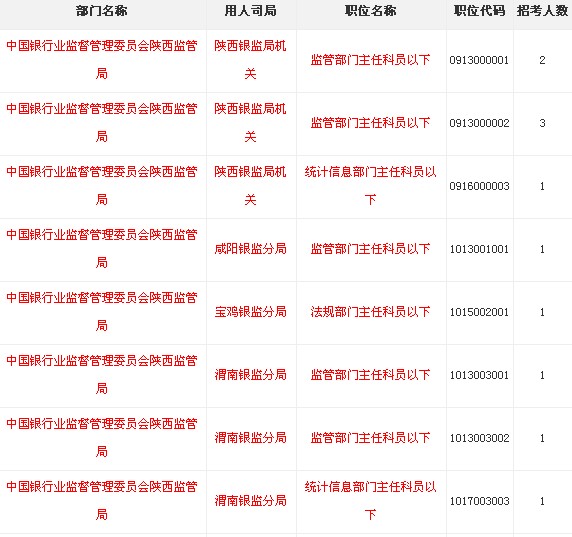 2014年國家公務員考試陜西銀監局職位表公布如下: