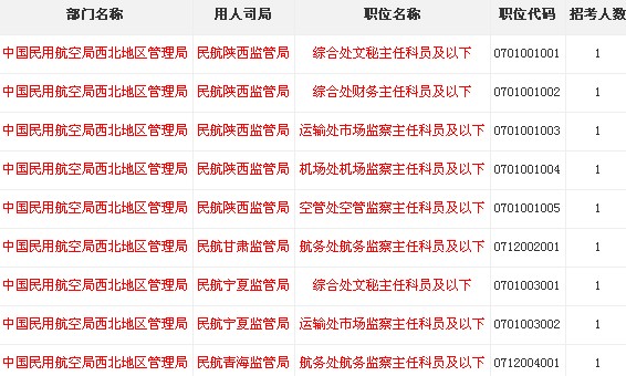 2014年國家公務員考試中國民航西北地區管理局職位表公布如下: