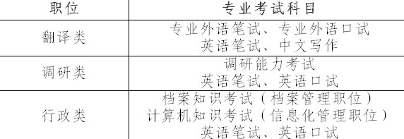翻譯類重點考察考生本專業外語的聽、說、讀、寫、譯等基本功;調研類重點考察考生的調研理論基本功、文字表達能力和英語水平;行政類重點考察考生的本專業知識和英語水平。全體考生均需參加心理素質測試(筆試,不計入考試成績)。報考英語翻譯職位的考生,參加專業外語筆試,不再進行英語筆試。