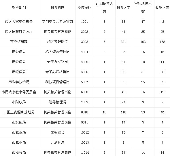 截止到10月21日上午9點,2013年湖北武漢市直機關公務員報名人數統計如下: