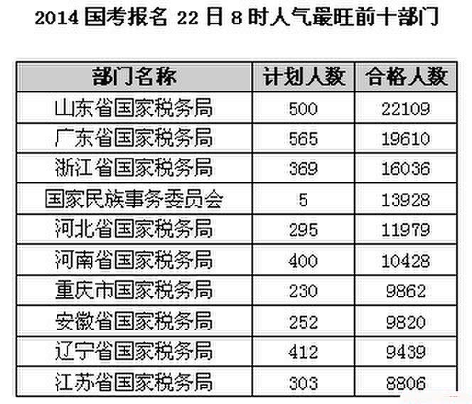 摘要 截至10月22日上午8時,2014國家公務員考試報名已經審核通過了611268人,比昨日此時的數據增長近18萬人。在各部門中,人氣最旺的十大部門里稅務占據了九個,其中連續幾天穩坐頭把交椅的山東省國家稅