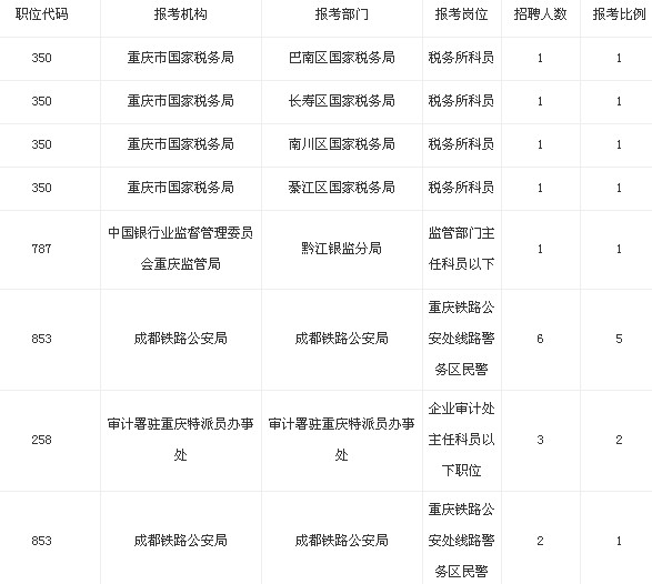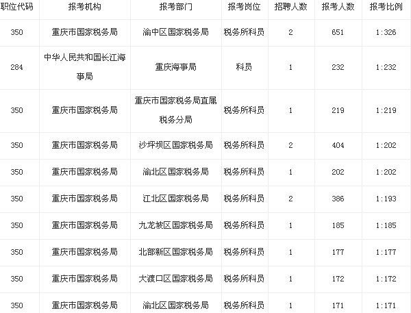 截止到10月21日11:00國家公務(wù)員考試重慶地區(qū)440個職位報考人數(shù)達(dá)10439人,平均競爭比例1:25.,最大競爭崗位:渝中區(qū)國家稅務(wù)局,招報比例1:326.大足區(qū)國家稅務(wù)局無人報名。