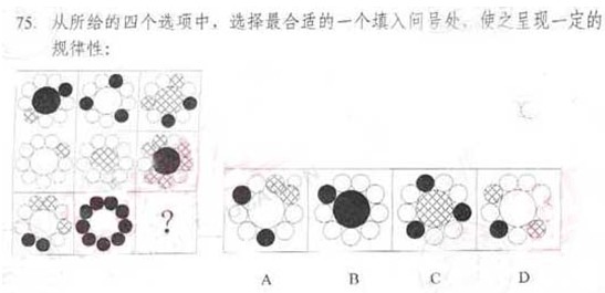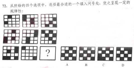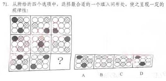 【解析】題干看上去有點復雜,大部分考生剛拿到這道題,會根據題干長得完全相同,只存在黑色,白色,花色三種顏色,存在位置上的一一對應,會誤認為是黑白疊加的題目,但是再仔細觀察會發現,這種推斷顯然是行不通的,因此,又會轉向考慮復雜的數量關系,黑色,白色,花色的個數問題等,一一排查完畢,均無結果,其實有種霧里看花,當局者迷的感覺。一旦我們從此道題目中把自己摘出來,大家會發現,從宏觀角度,不考慮細節,最直觀的感受是每幅圖里面都有黑棋,白棋和花旗,由此看,答案應該是A.