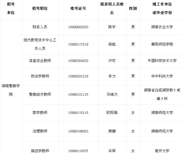 摘要 2013年湖南警察學院公務員擬錄用名單公示