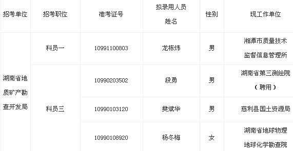 根據省委組織部、省人力資源和社會保障廳、省公務員局《湖南省2013年考試錄用公務員公告》的有關規定,經報名、資格審查、筆試、面試、體檢、考察等程序,確定2013年湖南省地質礦產勘查開發局考試錄用公務員擬錄用人員名單: