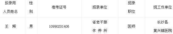 根據省委組織部、省人力資源和社會保障廳、省公務員局《湖南省2013年考試錄用公務員公告》的有關規定,經報名、資格審查、筆試、面試、體檢、考察等程序,確 定2013年湖南省老干部休養所考試錄用公務員擬錄用人員名單: