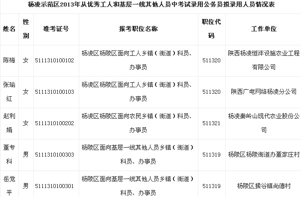 2013年陜西楊凌示范區(qū)從工農(nóng)中擬錄用公務(wù)員公示