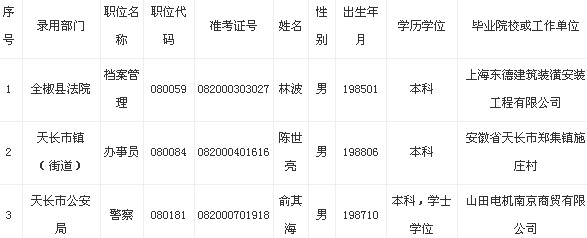 根據《滁州市2013年考試錄用公務員工作實施方案》(滁人社發〔2013〕28號)等規定,報全椒縣法院等部門的林波等考生,經報名、筆試、面試、體檢與考察等程序,符合本次考試錄用條件,擬錄用為公務員。現向社會公示7天,節假日順延。公示期間如有問題,請及時向市委組織部、市人社局反映。監督聯系電話:市委組織部干部綜合科0550-3044060、市人社局公務員管理辦公室0550-3022415。
