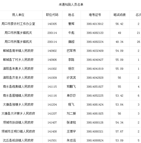 由于以下考生(見附件)所留聯(lián)系方式不能聯(lián)系到本人,請你們看到本緊急通知后按照《河南省2013年統(tǒng)一考試錄用公務(wù)員周口市面試資格確認公告》的要求,在規(guī)定時間內(nèi)進行面試確認,逾期不到者,視為自動放棄面試資格。