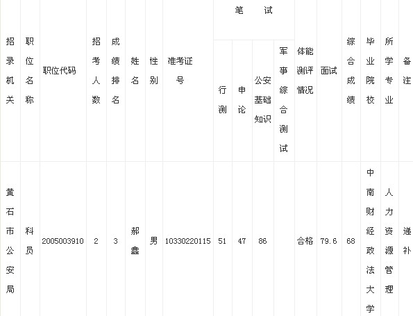 根據《湖北省2013年度遴選選調生和考試錄用公務員工作實施方案》,經請示省公務員局、省公安廳同意遞補錄用10330220115考生。經體檢和考察,現將該錄用人員予以公示,公示期為11月8日至11月4日。公示期間,如對擬錄用人員有異議的,可通過電話、信件、傳真等方式向黃石市人力資源和社會保障局反映。請舉報署真實姓名,并提供事實依據、證據材料及聯系方式。