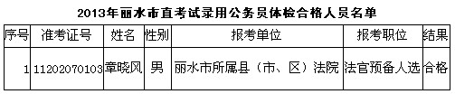 2013年浙江省麗水市直公務員體檢合格名單公布