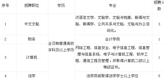 招聘職位及人數:中文文秘3人,財務1人,計算機1人,法學5人。各招聘職位報名人數達不到計劃招聘人數3倍的,按1:3的比例相應核減招聘計劃。