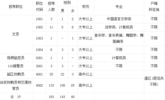 文員、視頻監控員和110接警員職位的招考對象為社會上具有國家承認學歷的大專畢業以上人員,不限戶籍;監區協勤員、治安協勤員和交通協管員職位的招考對象為具有國家承認學歷的高中畢業以上人員,限湛江(含五縣五區)常住戶口。退伍兵報考者不限戶籍。